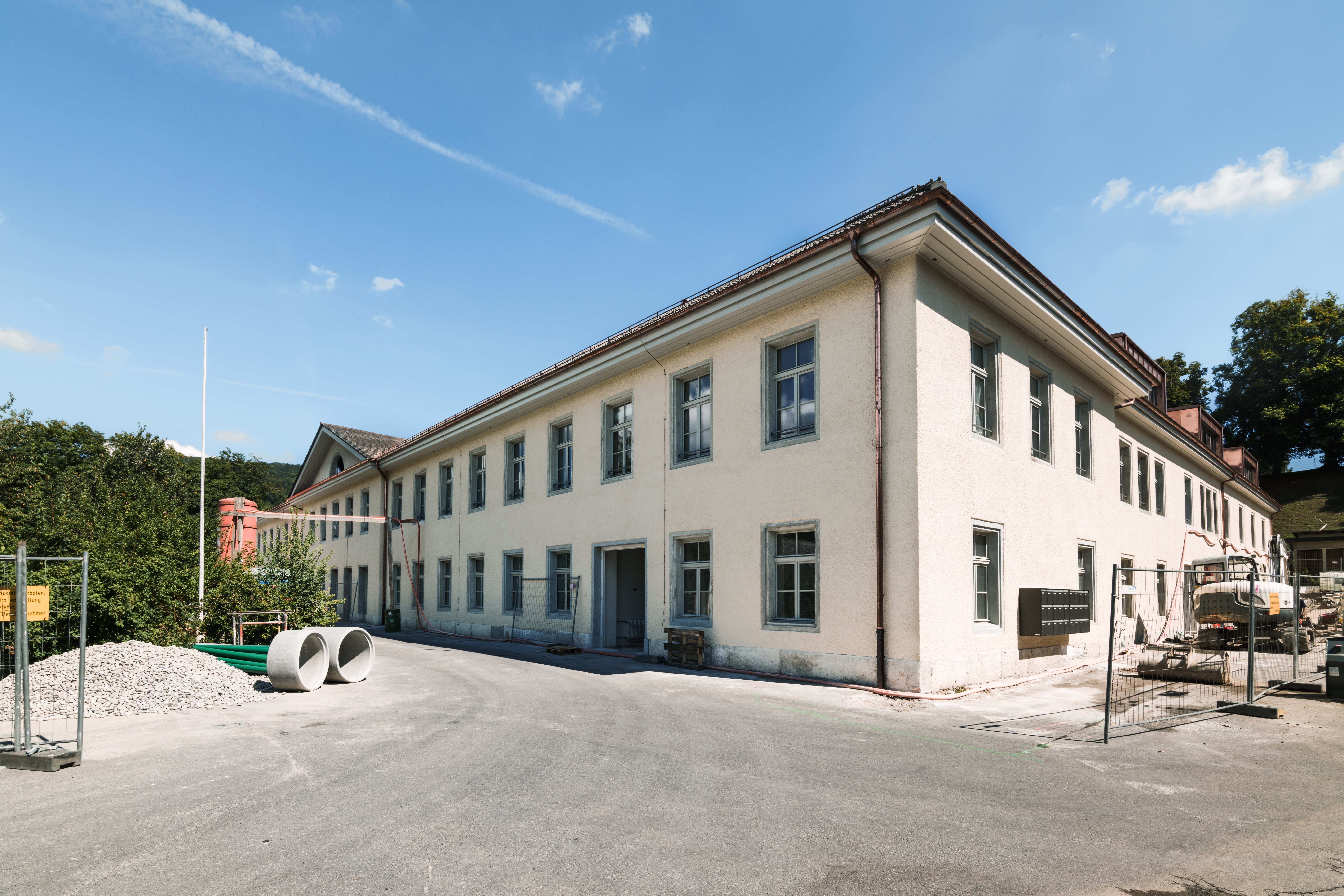 The factory building on the former Lauématt industrial site in Möriken-Wildegg had significant defects in its structure. The building had been converted several times over the years due to its different uses. Condition surveys and recalculations showed that the existing ceilings no longer met today's load requirements and that the earthquake-resistant design was inadequate. We worked closely with the architects and the conservation authorities to make the historic building structurally sound. New stairwells in solid construction were integrated, ceilings were made of concrete and wood, the roof in the side wings was replaced and new earthquake walls were installed. The existing shed hall was dismantled and replaced by a modern steel hall, for which we were also responsible for the structural engineering.