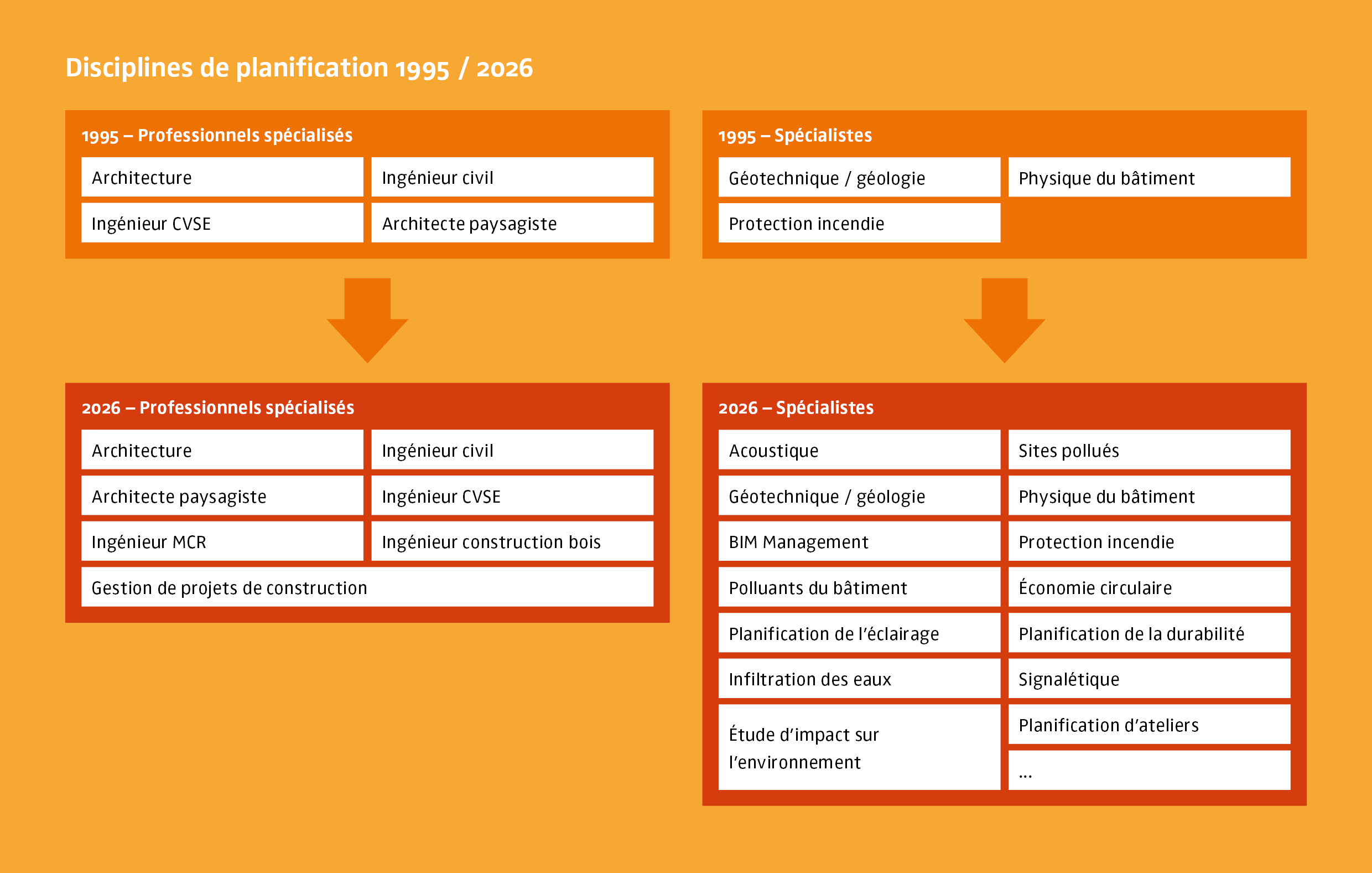 Tobias: Les nouvelles constructions et les transformations doivent aujourd'hui répondre à de très nombreuses exigences et normes, notamment en matière de sécurité, de protection incendie, de polluants du bâtiment, de sites contaminés, de protection contre le bruit, d'inclusion, d'impact sur l'environnement et de climat urbain. Les bâtiments modernes sont également souvent très techniques, notamment en ce qui concerne les systèmes énergétiques et informatiques. Bref, pour construire avec succès, il faut aujourd'hui davantage de connaissances et la capacité de réunir les nombreuses disciplines en un tout.